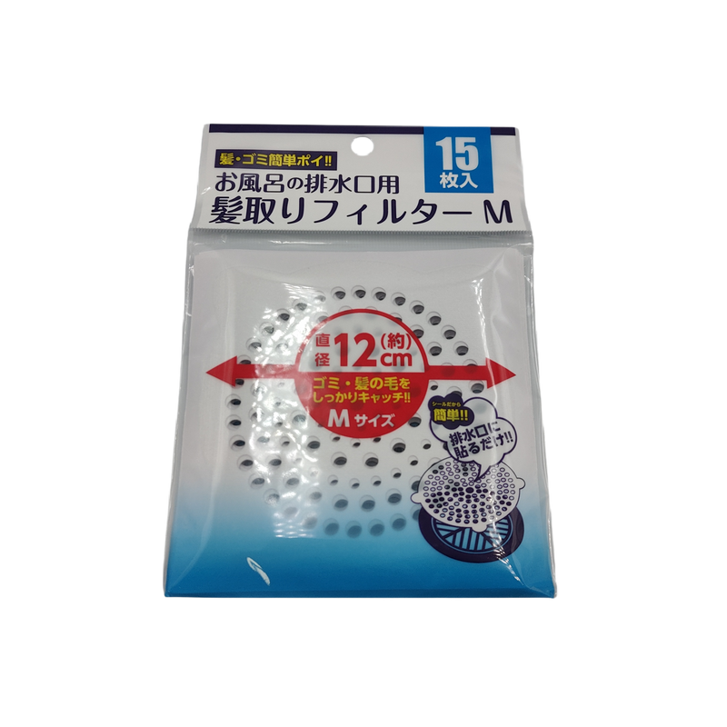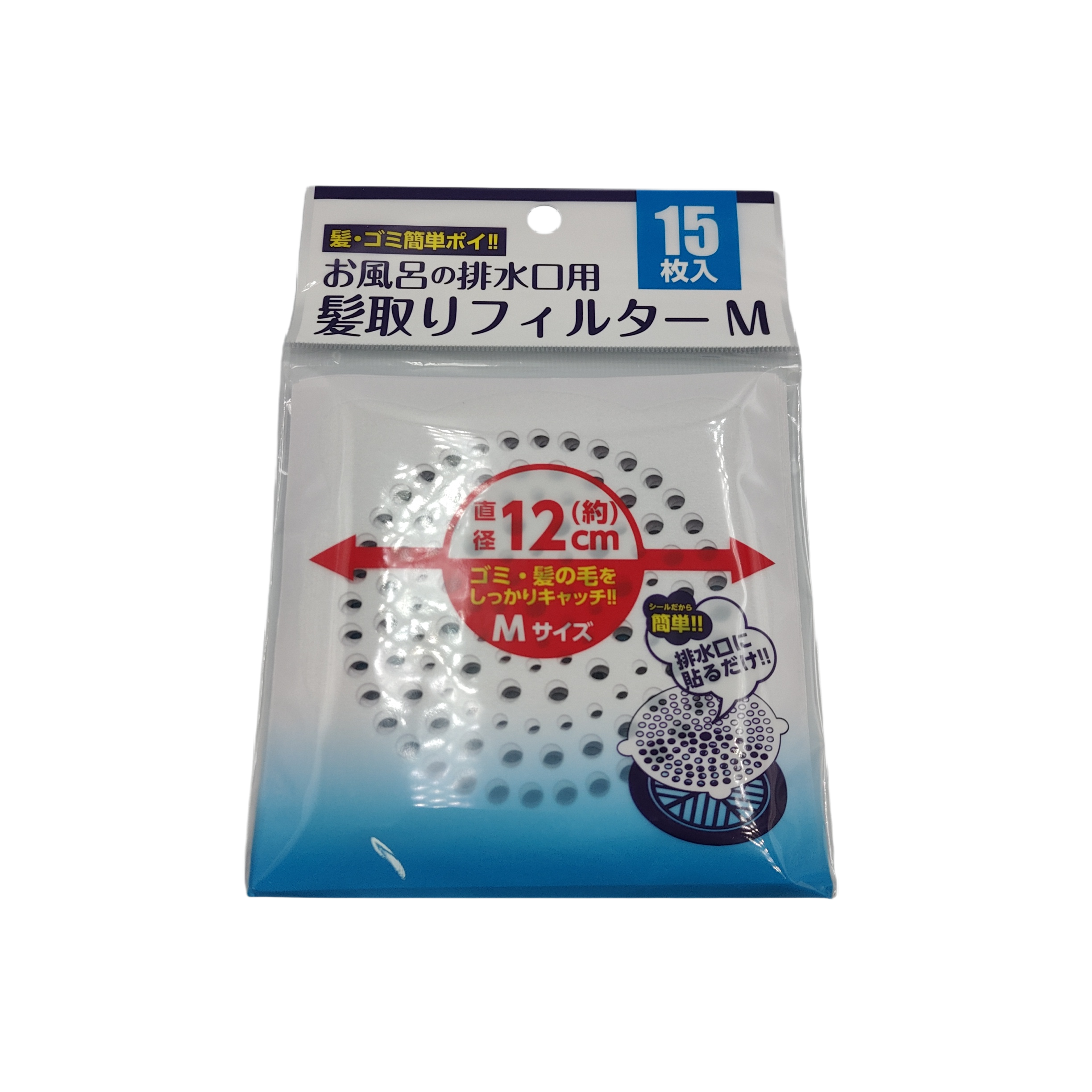 This is a size M size sticker-type hair removal filter that is attached to the drain of the bath. Simply stick it on the drain to catch dirt and hair. It's disposable so it's hygienic.