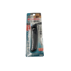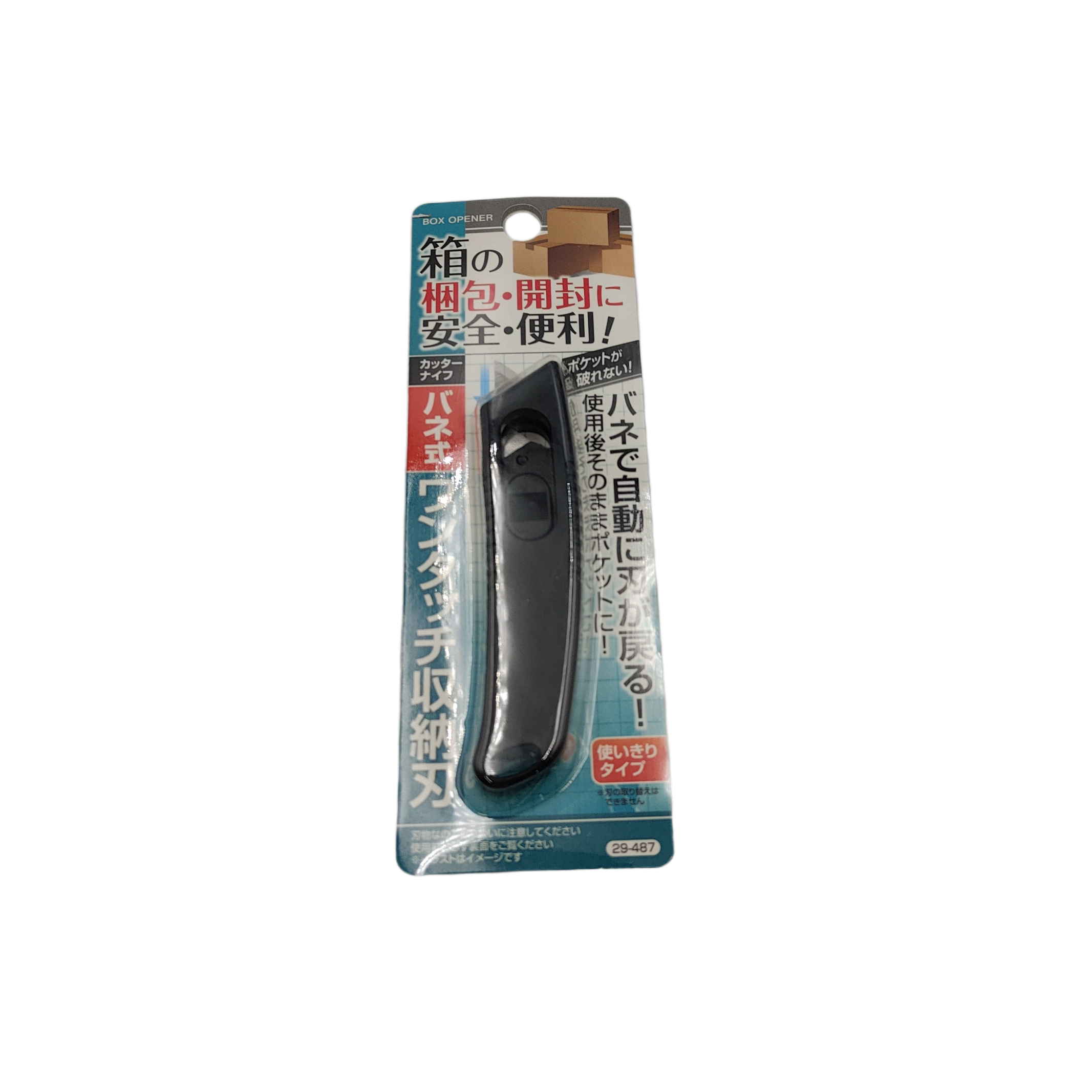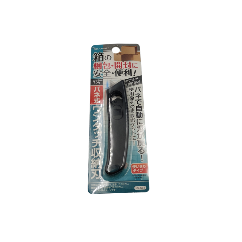 A mini cutter for opening cardboard boxes. When you press it, the blade comes out a little, and when you let go, the blade retracts with a spring. The blade only protrudes a little, so it won't damage the contents, and the blade automatically returns, making it safe.