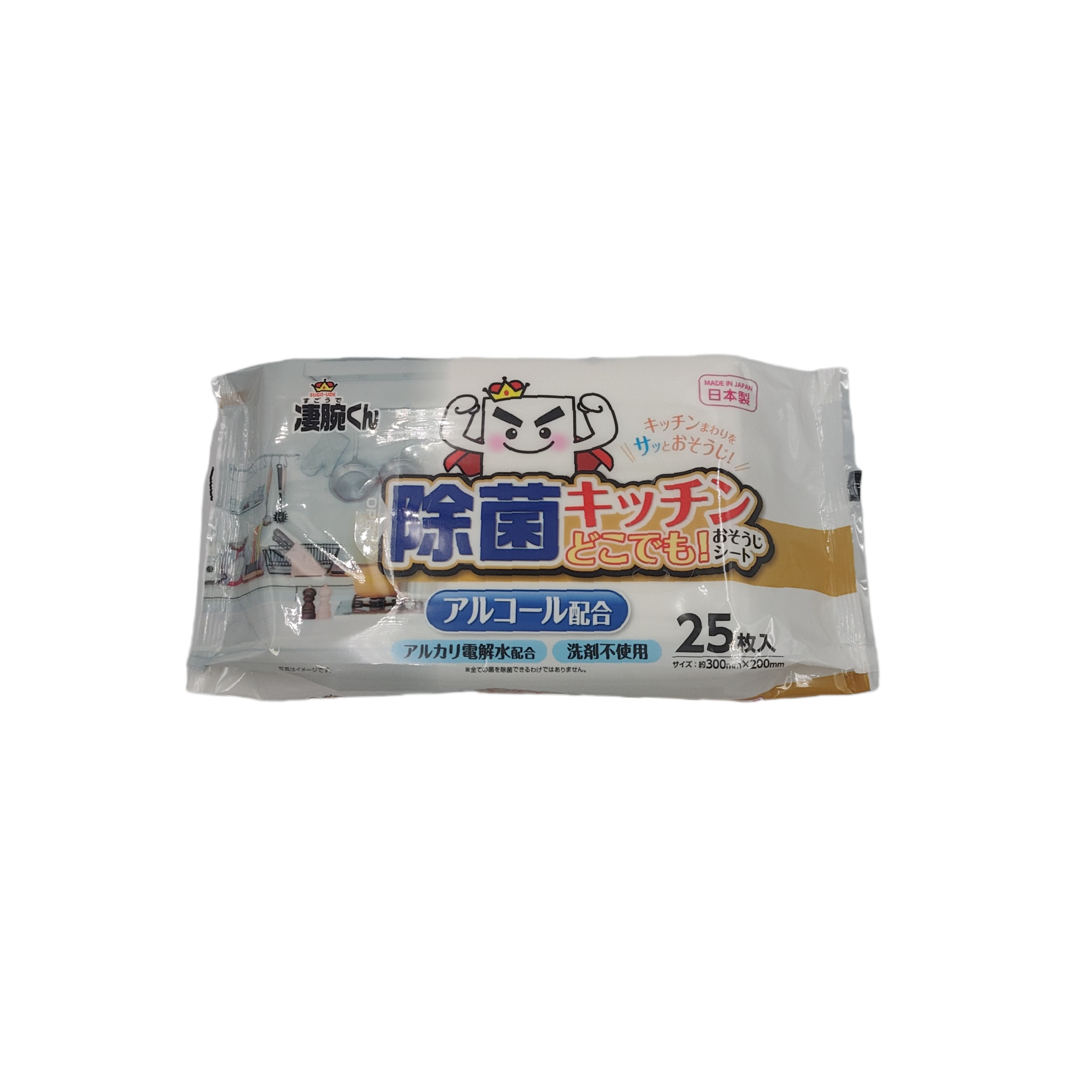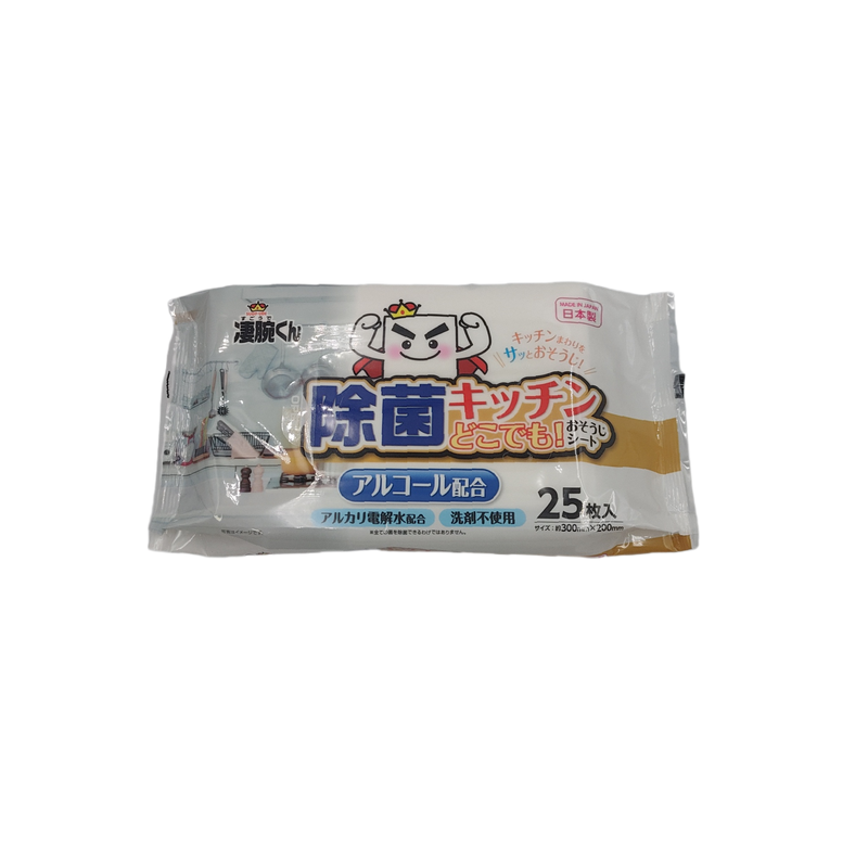 This cleaning wet sheet contains alcohol and alkaline electrolyzed water. It does not contain detergent and is useful for disinfecting kitchen counters and wiping off light oil stains.