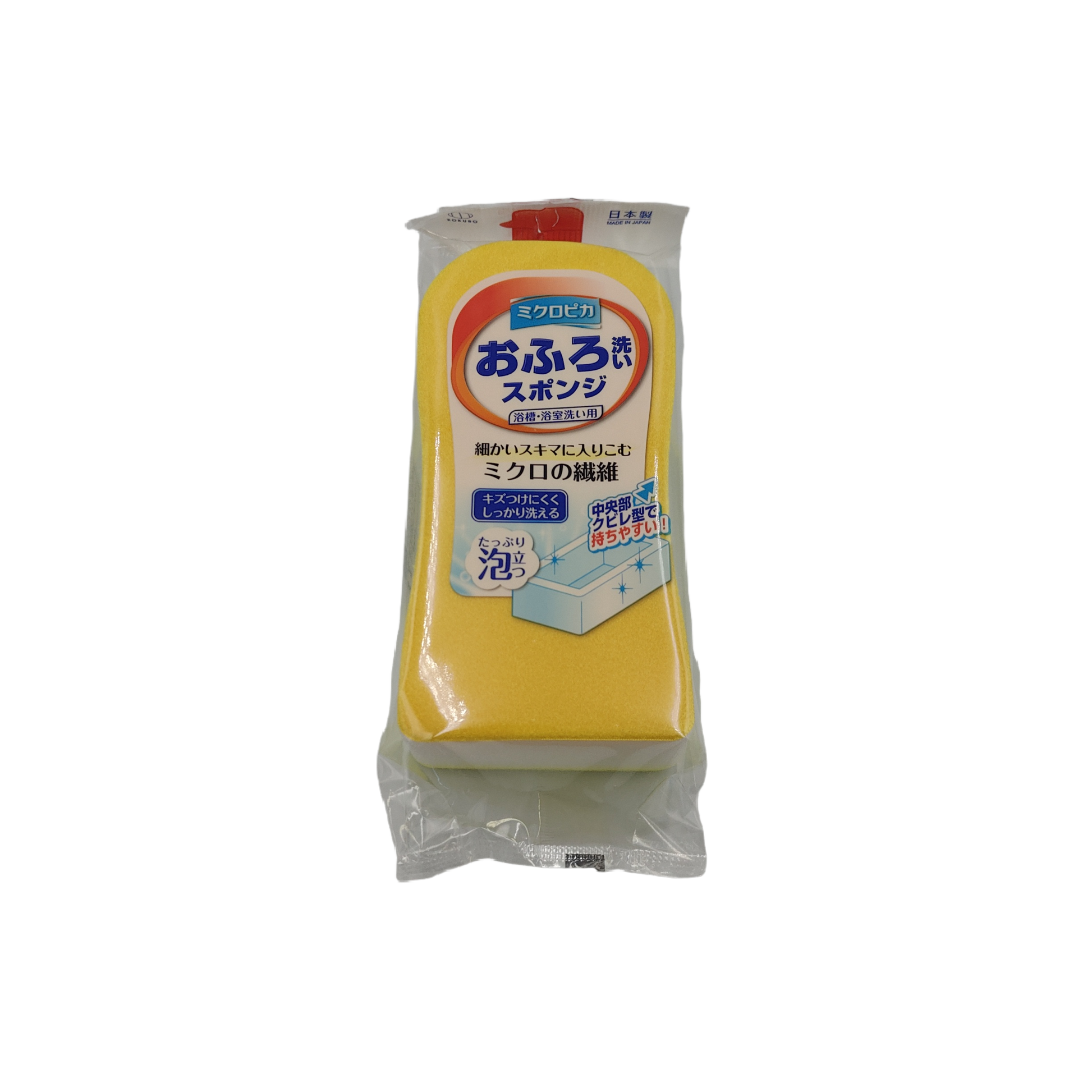 | Description of item | ・A sponge for cleaning bathtubs and bathrooms with micro fibers that penetrate into small gaps. ・Generates plenty of foam, does not scratch surfaces, and cleans thoroughly. ・The narrowed center makes it easy to hold. ・The packaging is reminiscent of bath detergent. |