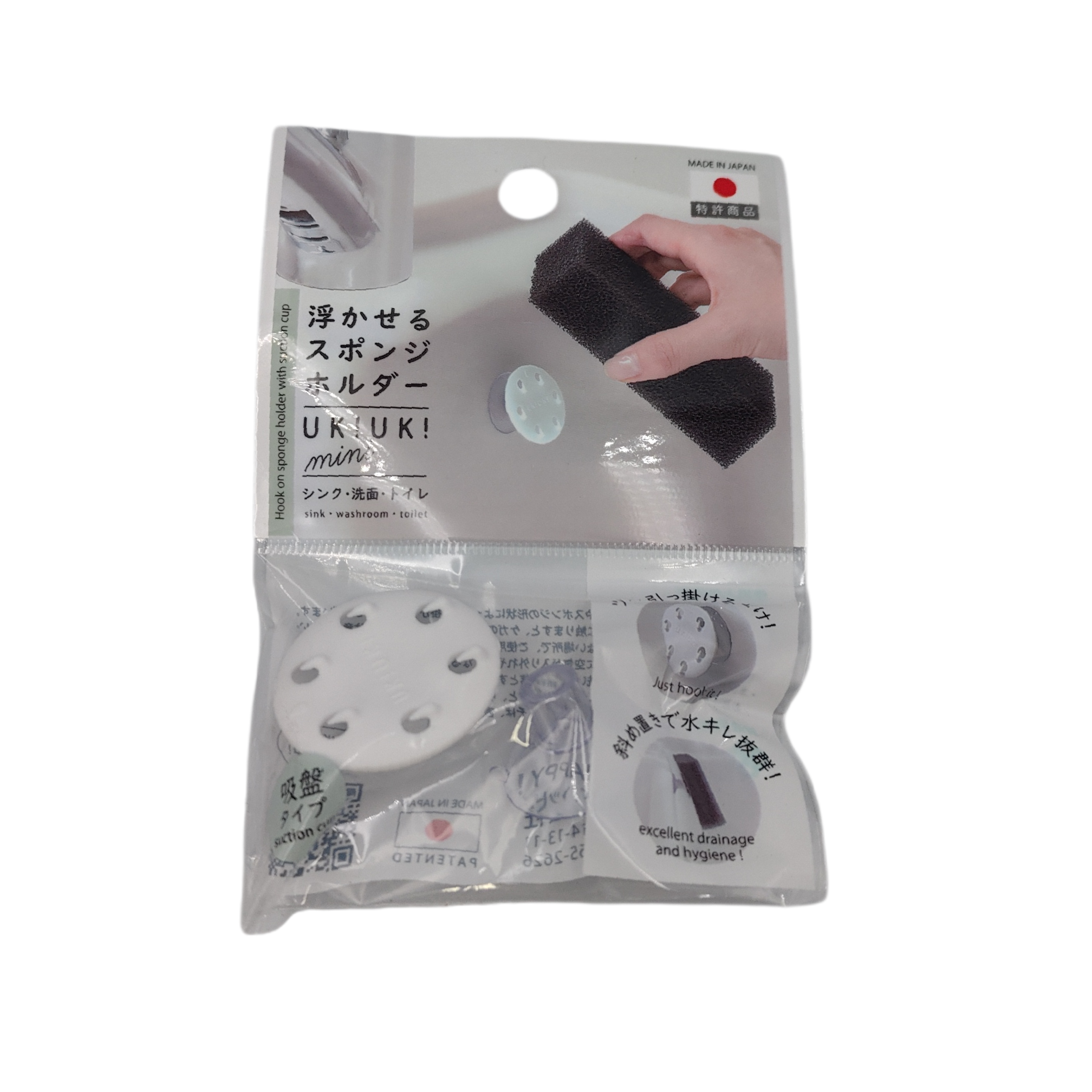 A sponge holder that stores sponges floating. Can be used in sinks, washrooms, toilets, etc. Cannot be installed on uneven, rough, or embossed surfaces. Depending on the shape of the melamine sponge or sponge with a fine surface, it may not stick. To prevent deformation and damage, do not use the dishwasher or dryer.