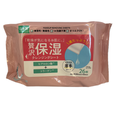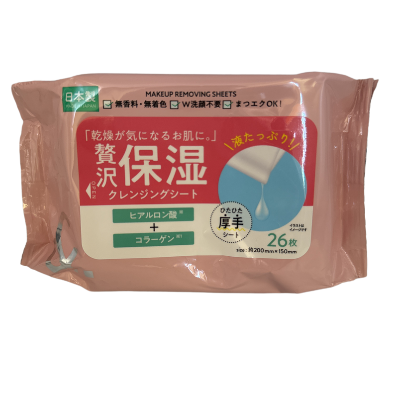 A cleansing sheet containing hyaluronic acid and collagen. It will be a thick sheet full of liquid. Contains 26 pieces.