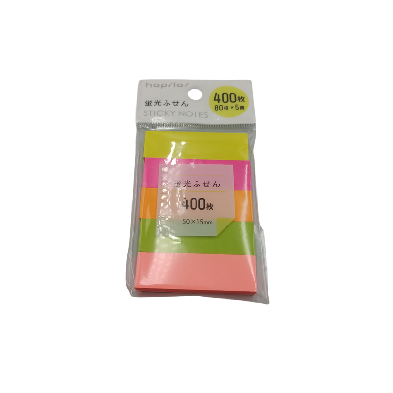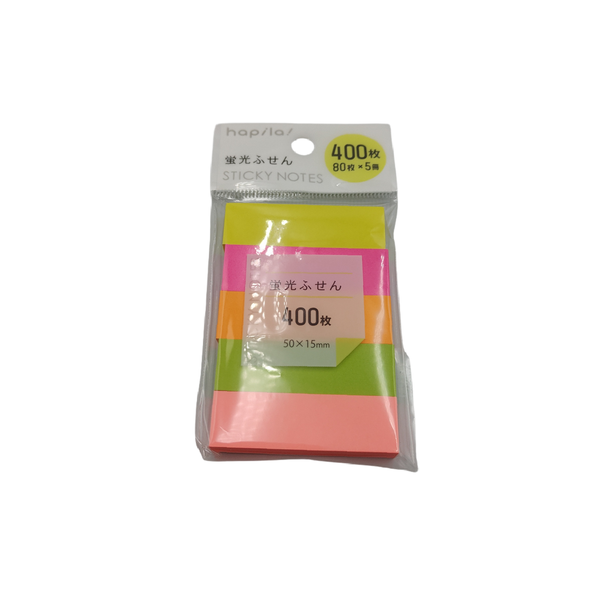 - Fluorescent sticky notes with a size of 50 x 15 mm. - Contains 80 sheets x 5 colors. - Contains yellow, shocking pink, orange, green, and salmon pink colors.