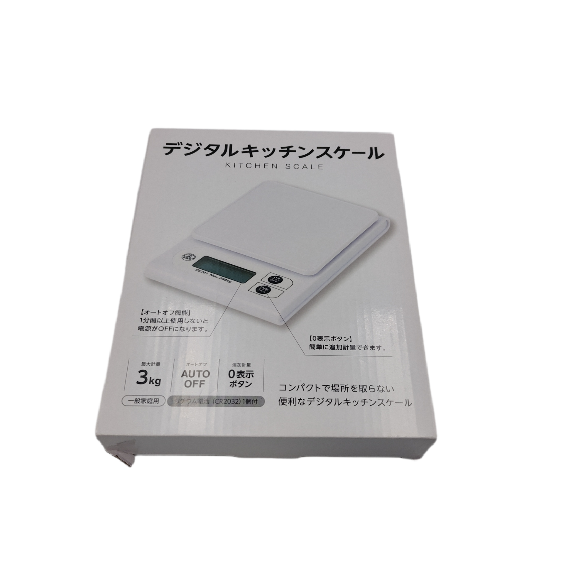 | Description of item | ・A kitchen scale manufactured and inspected according to technical standards based on the Measurement Law.・ Accuracy standard: ± 2g up to 750g, ± 6g over 750g up to 3000g・ Maximum weighing: 3 kg・ Minimum weighing: 3g・ Power supply CR2032 x 1 (trial battery included)・ If you do not use it for more than 1 minute, the power will be turned off automatically.・ There is an additional weighing function that can display 0g after placing the container. |