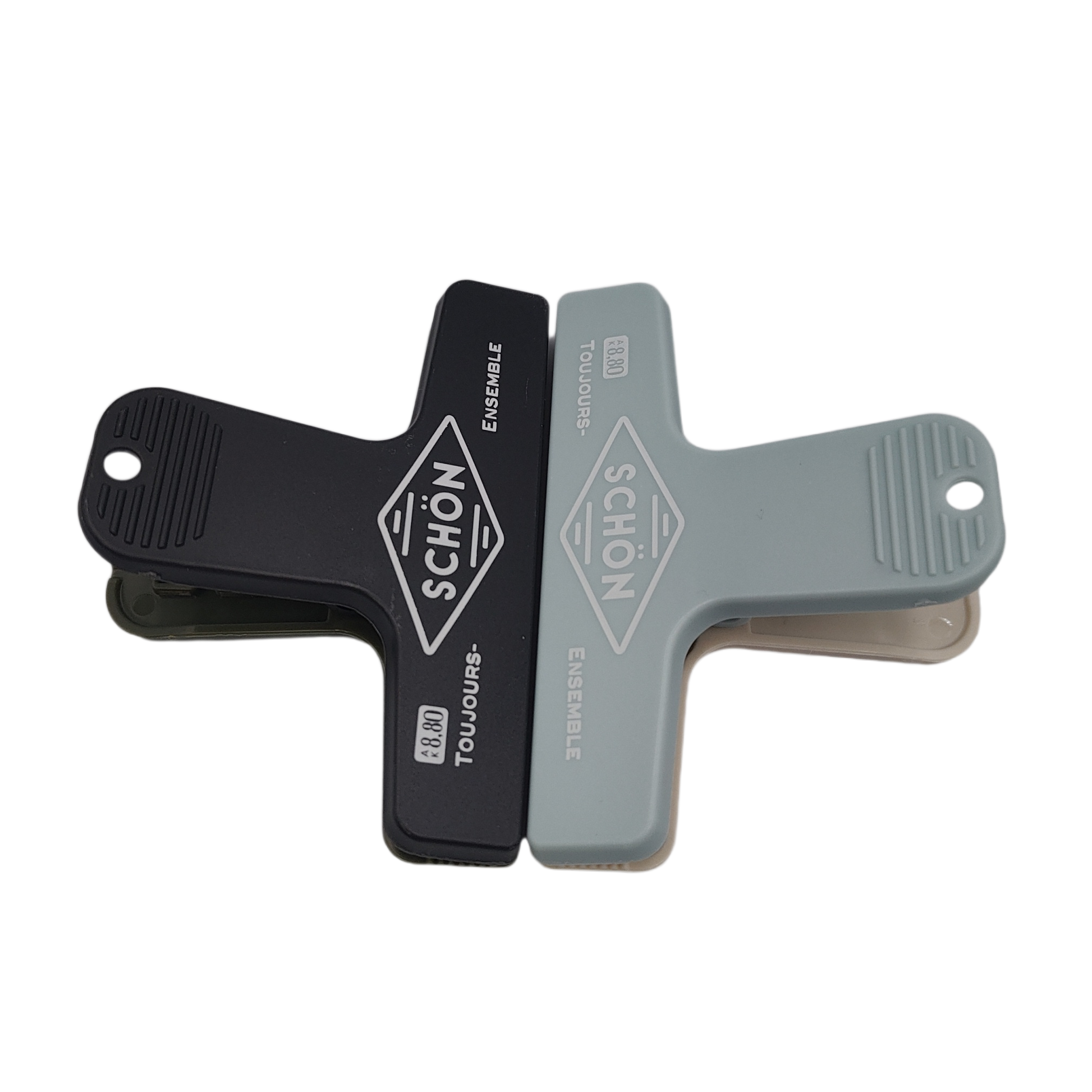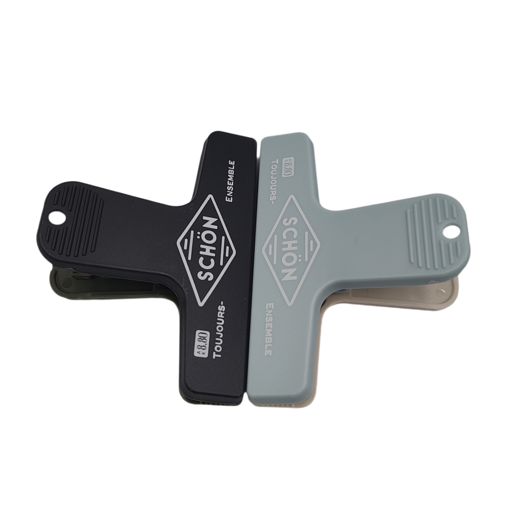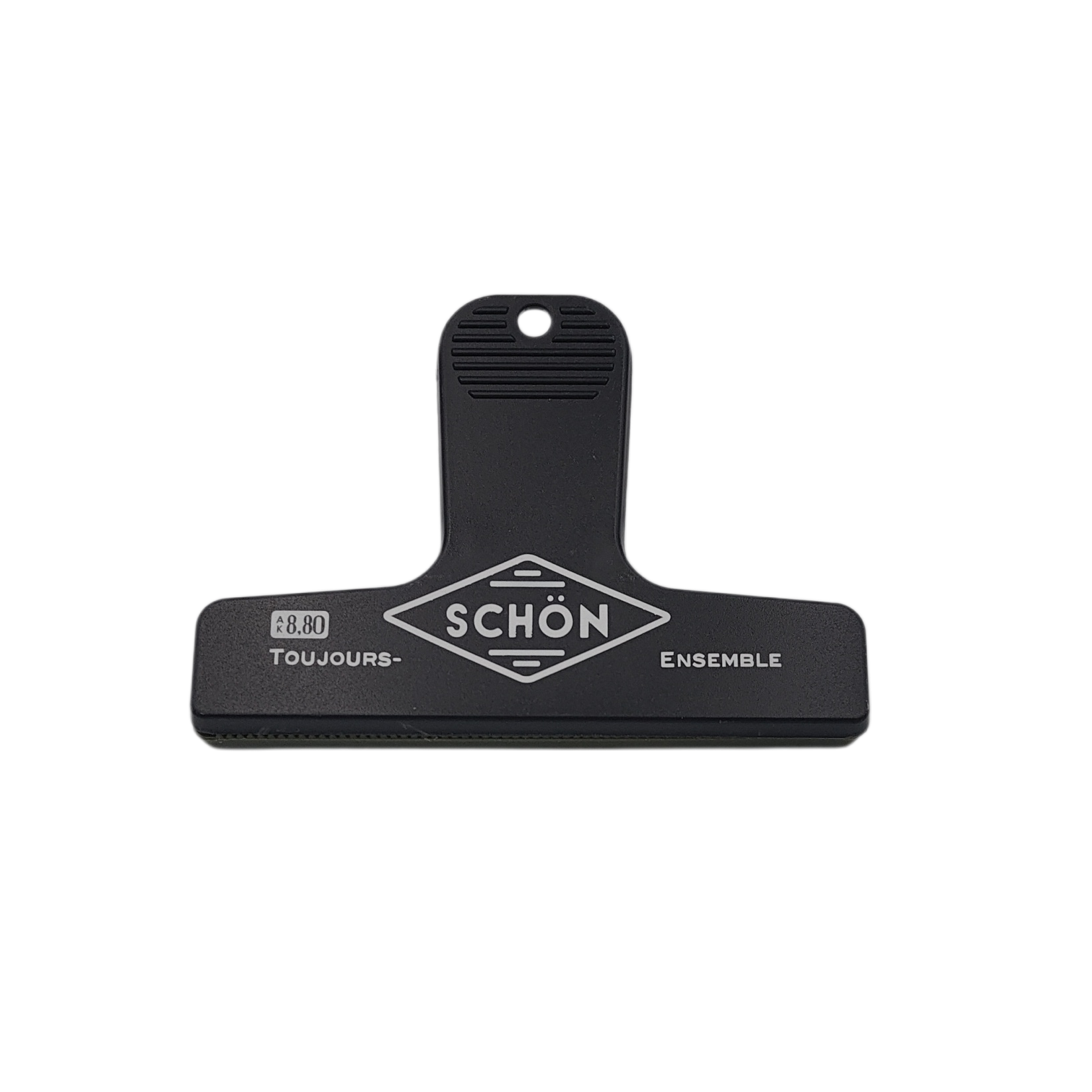 A plastic clip with a stylish logo printed on it.