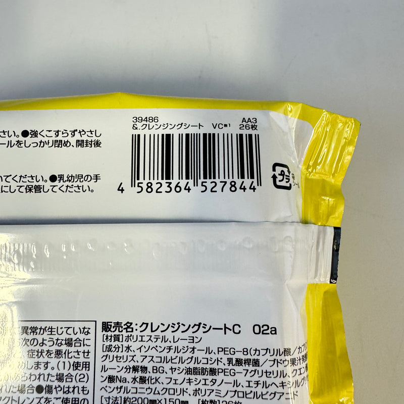 A cleansing sheet containing vitamin C. . It will be a thick sheet full of liquid. Contains 26 pieces.