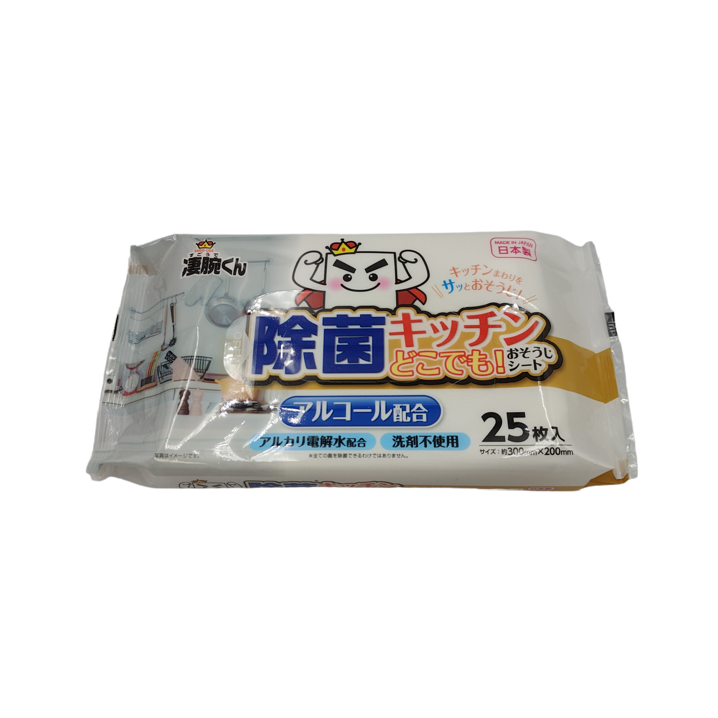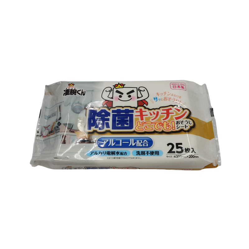 This cleaning wet sheet contains alcohol and alkaline electrolyzed water. It does not contain detergent and is useful for disinfecting kitchen counters and wiping off light oil stains.