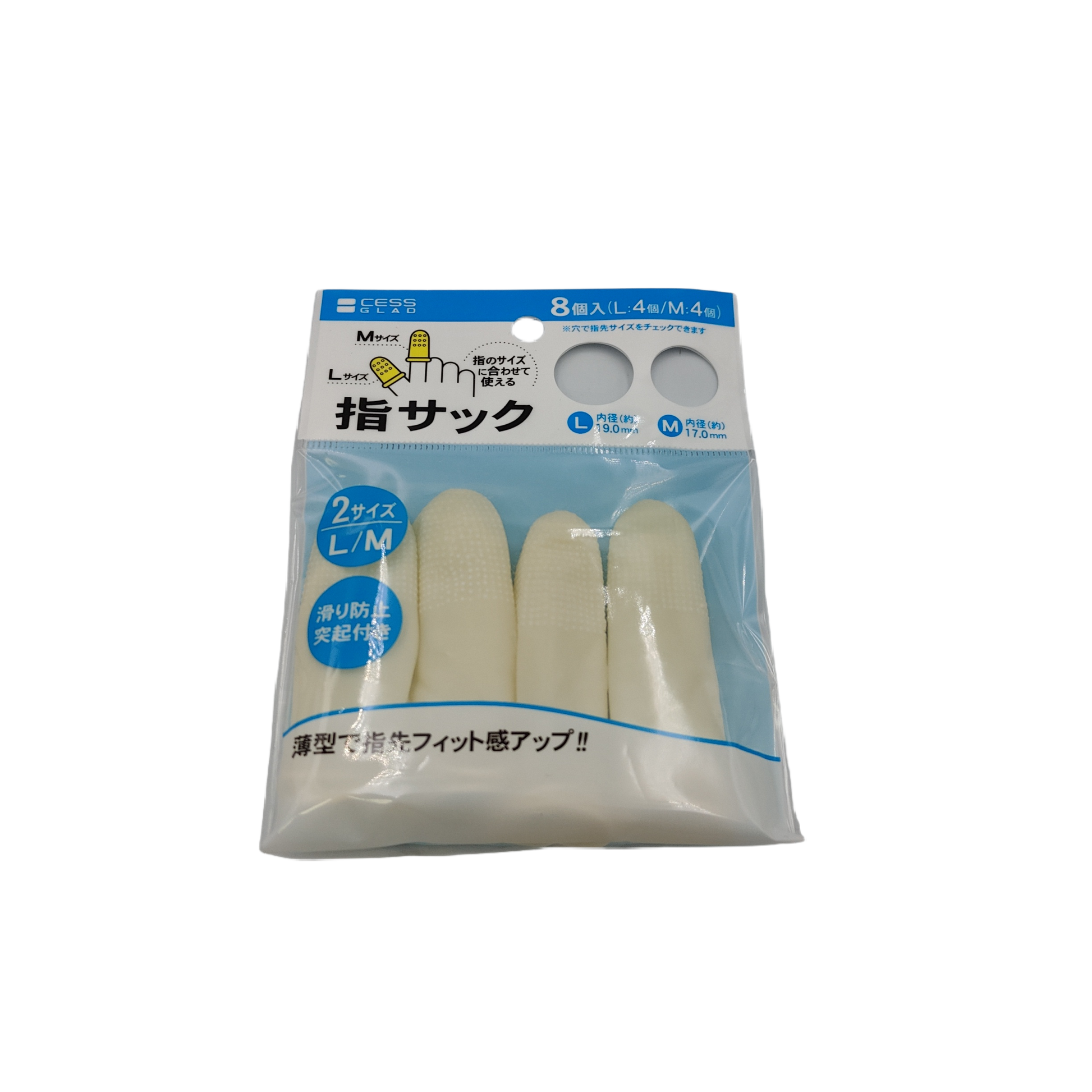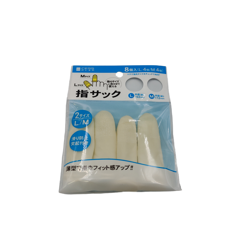 ・These finger cots are a clean, white color. ・There are 4 of each for index fingers (inner diameter approx. 17 mm) and thumbs (inner diameter approx. 19 mm). ・They are thin and fit gently on the fingers, and have anti-slip ridges on the fingertips.