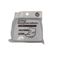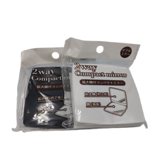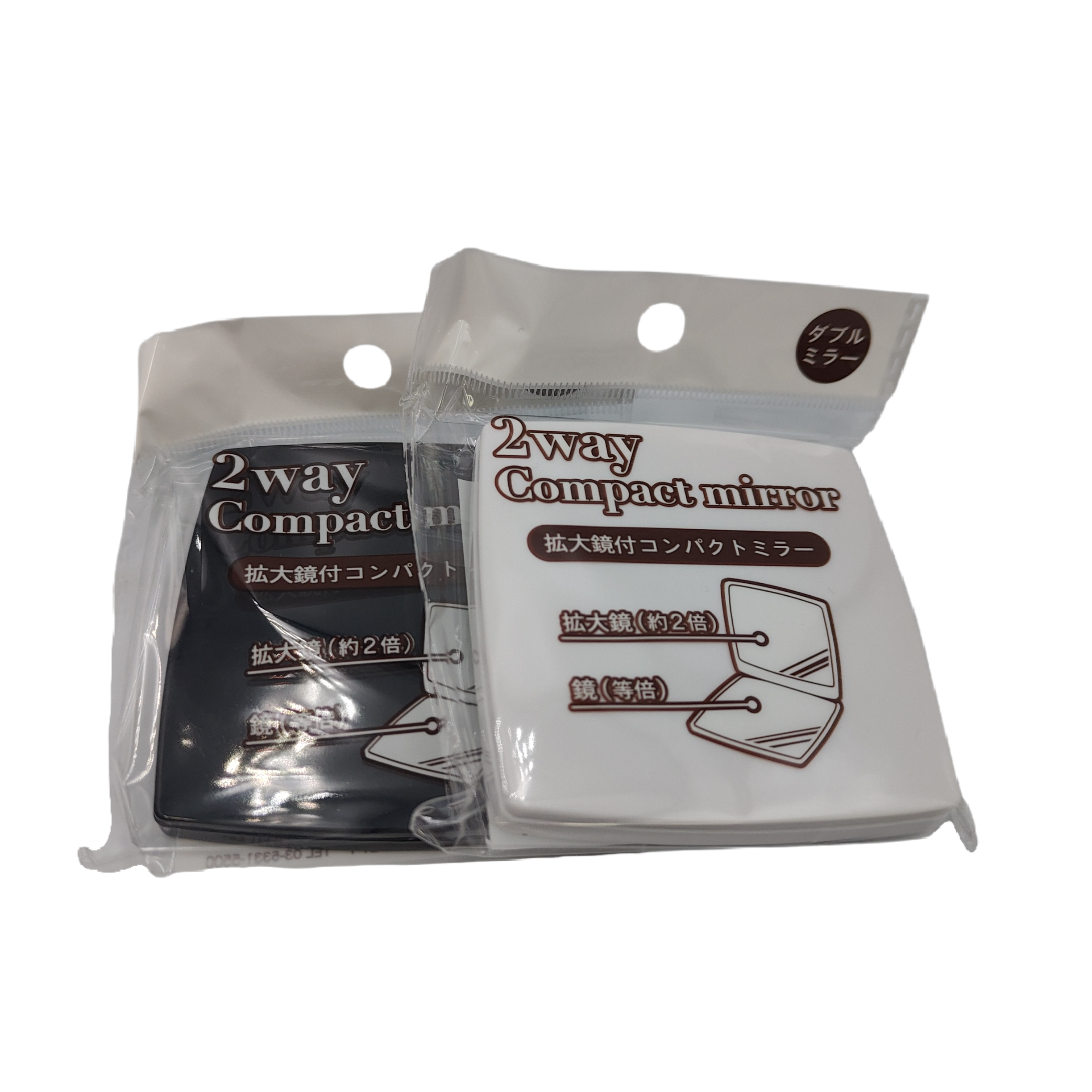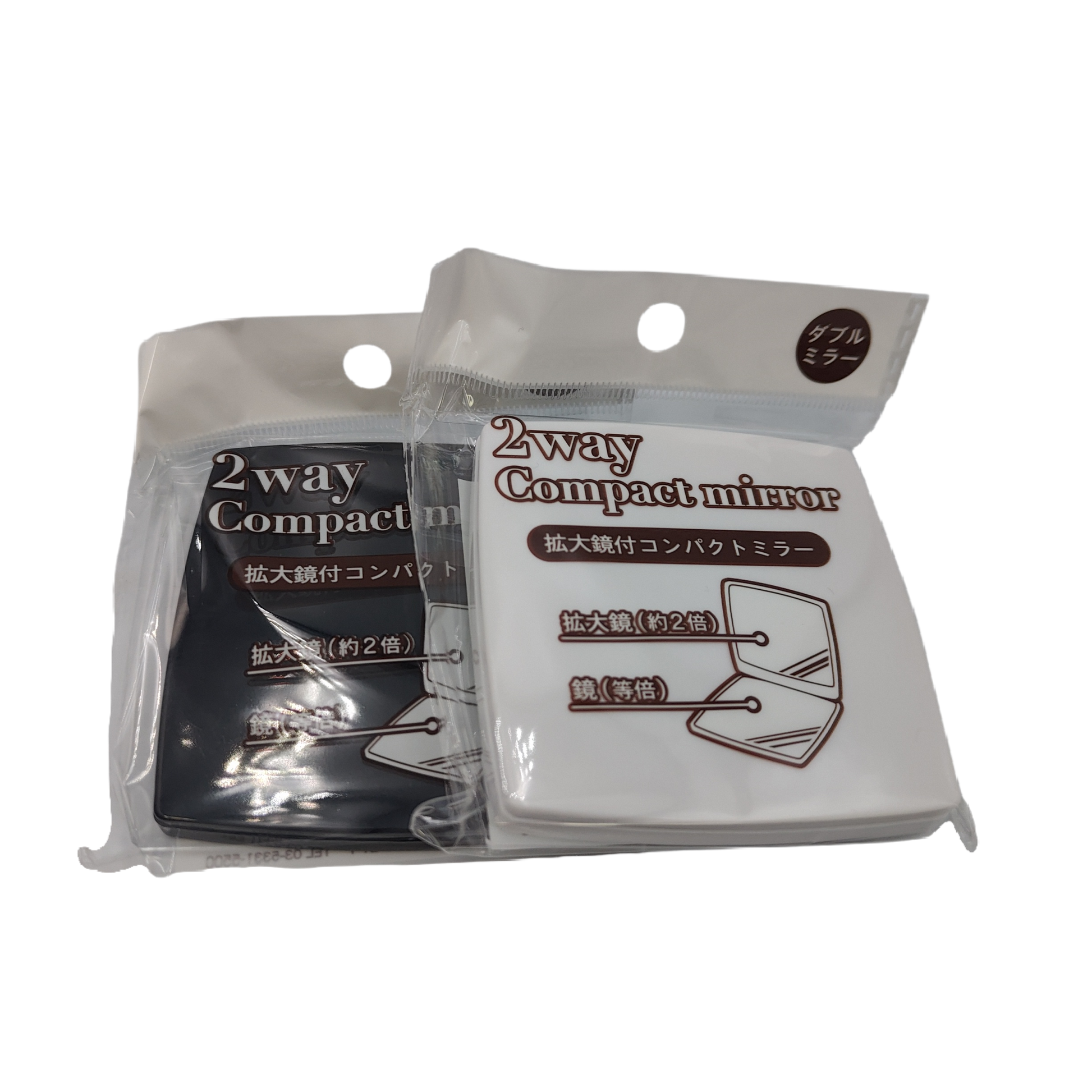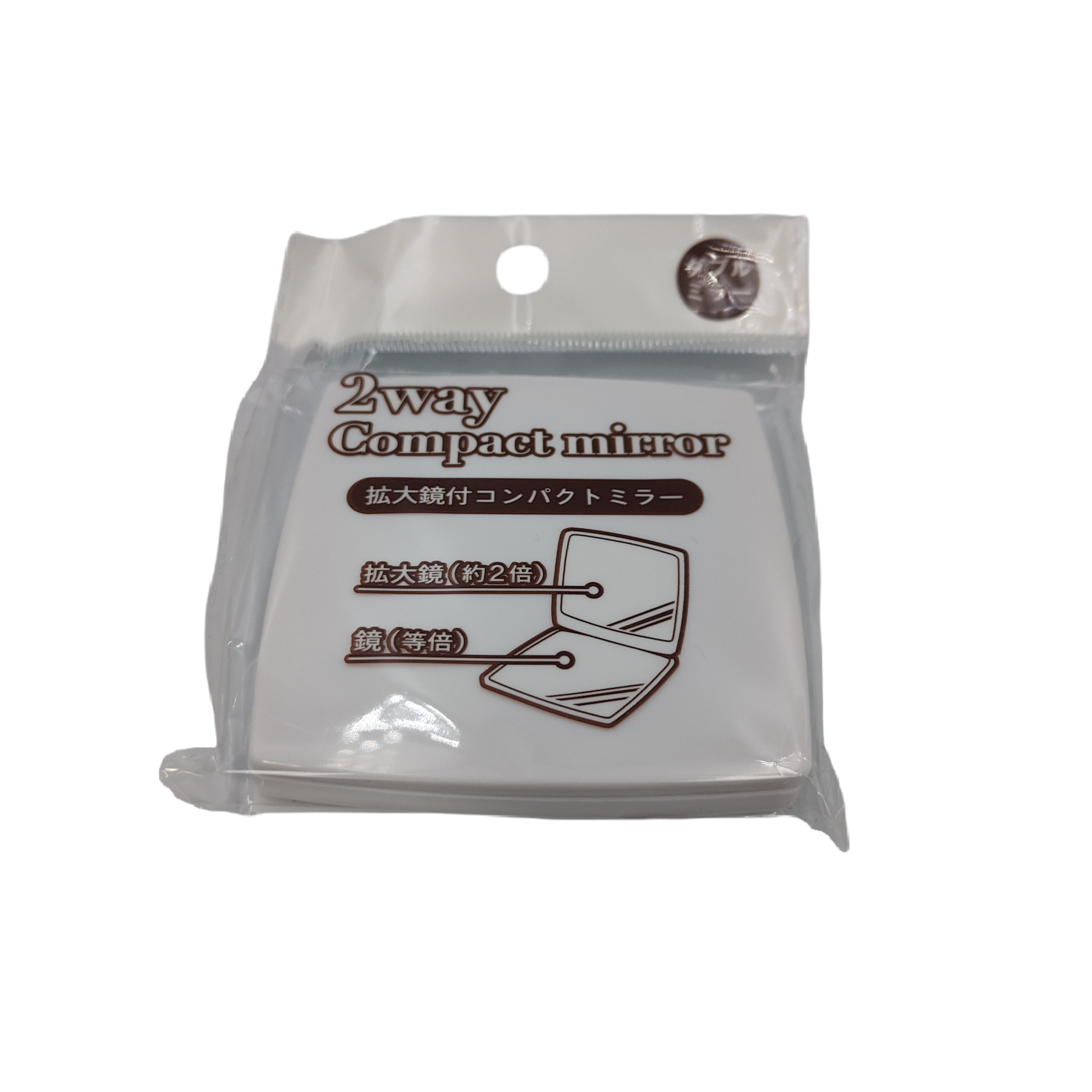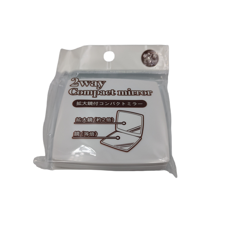 This is a square-shaped compact mirror that includes a regular mirror and a magnifying glass that is approximately 2x larger.