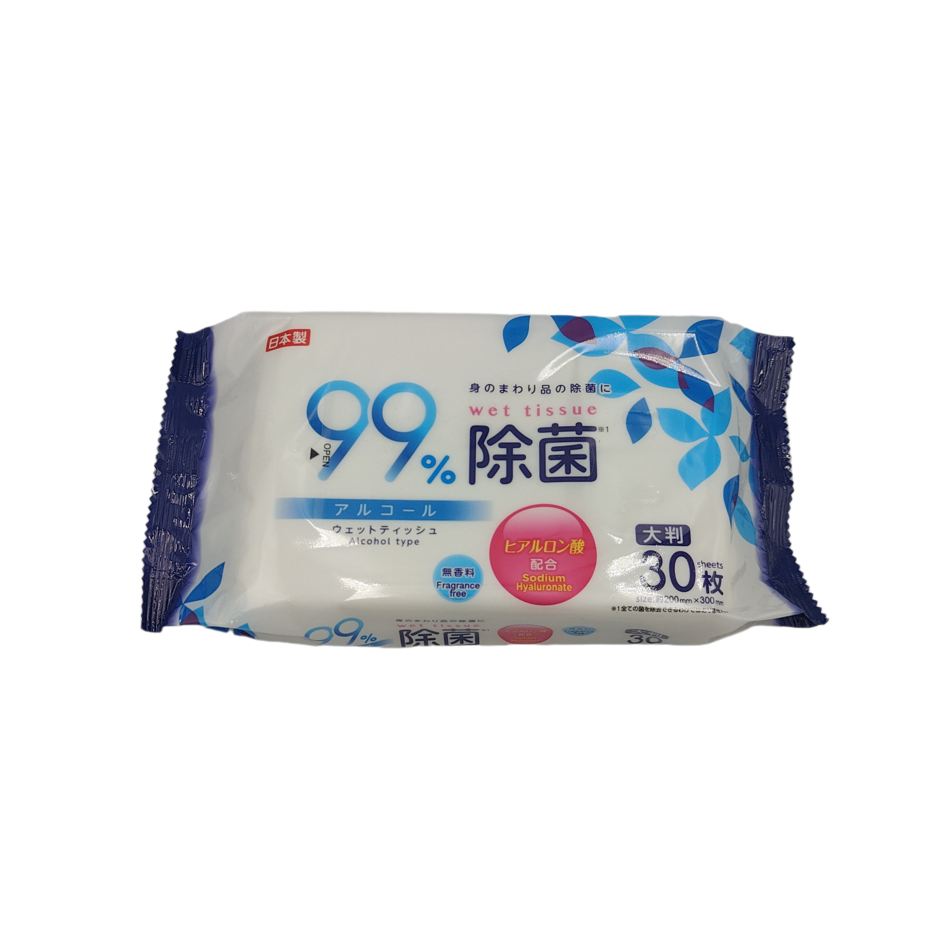 ・Large-sized wet wipes with 99% alcohol disinfectant. ・Contains hyaluronic acid, fragrance-free, and paraben-free. ・Ideal for disinfecting personal items. ・Comes in a value pack of 30.